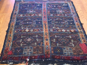 a strange but undeniably special little piece. Northwest Persian/Caucasian. 4'10" x 2'9". All original. a small reattached section at the top.