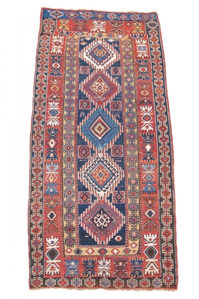 Shirvan Kilim Caucasus, Mid 19th C. This dynamic, colorful and finely woven Shirvan flat-weave gives more than ample evidence that the best antique kilims produced need not to have originated in Anatolia. Bold latch-hook medallions with a variety of centers are drawn in red, blue and white against an indigo field and set within a classic 2-1-2 formation against smaller diamond and latch-hook centered box ornament. The main border, a particularly idiosyncratic variation of the so-called ムharshangメ or crab border gives evidence of Original condition with minor separations of slip weave tapestry technique. Very minor re-weaving. SIZE: 5' 7" x 11' 2" INV# 15515 |  |