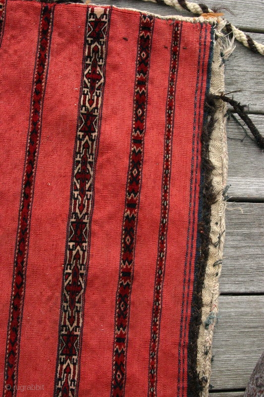 (11) Tekke Kizil Juval, 135 x 80 cm, 19th c. This big bedding bag has 9 finely and expertly knotted bands (two are white-grounded) on a blood-red, very robust flatweave with an empty elem. Complete with cords, this is a true working nomad storage bag clearly not made for sale. i found it in a pile in a damp basement, but it has no mildew and is dry. Could use a gentle bath. Has a couple of tiny holes in the elem area. Price includes shipping anywhere.