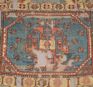 17th century / circa 1700 Bergama area 2-1-2 large pattern Holbein derived carpet.A larger longer format than later 18th century varieties with dynamic and deliberate imagery formed from negative space. Inexplicably cut into five fragments.