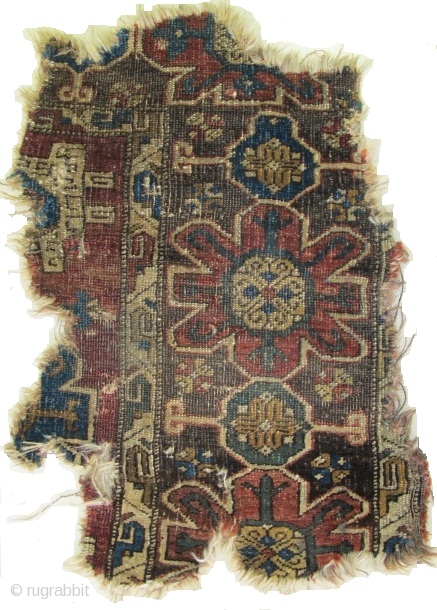 3 Fragments from a Significant Near Eastern Carpet found in Tibet. Most probably 17th century based on design and relation to classical prototypes from northwest Persia. These fragments are structurally a little bit strange. The weft is un-plied, two to three shots, high warp depression with symmetrical knots pulled significantly to the left. My guess is that it is nw Persian / Azerbaijan or perhaps Eastern Anatolian so-called "Golden Triangle" region and relates to a period when these neighboring regions were intimately connected. Perhaps Kurdish weavers?