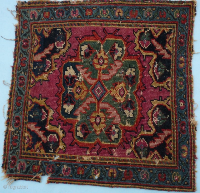 (60) Kurdish bag face, mid19th c., some moth damage but what a gem! 54 x 55 cm. Has good age and fine colors.