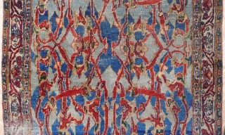An antique 'Hadji Jalili' Tabriz carpet fragment, 5ft x 2.85ft (153 x 87 cm.) circa 1870-1880. The pale blue ground with arabesque, garrus type of floral design with rust brown tendrils. Typical Hadji Jalili subdued colour palette with pale blue, soft ocre and abrashed mid-blues. This rug has been assembled from a larger carpet and has been skilfully cut and shut in several places.