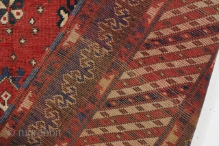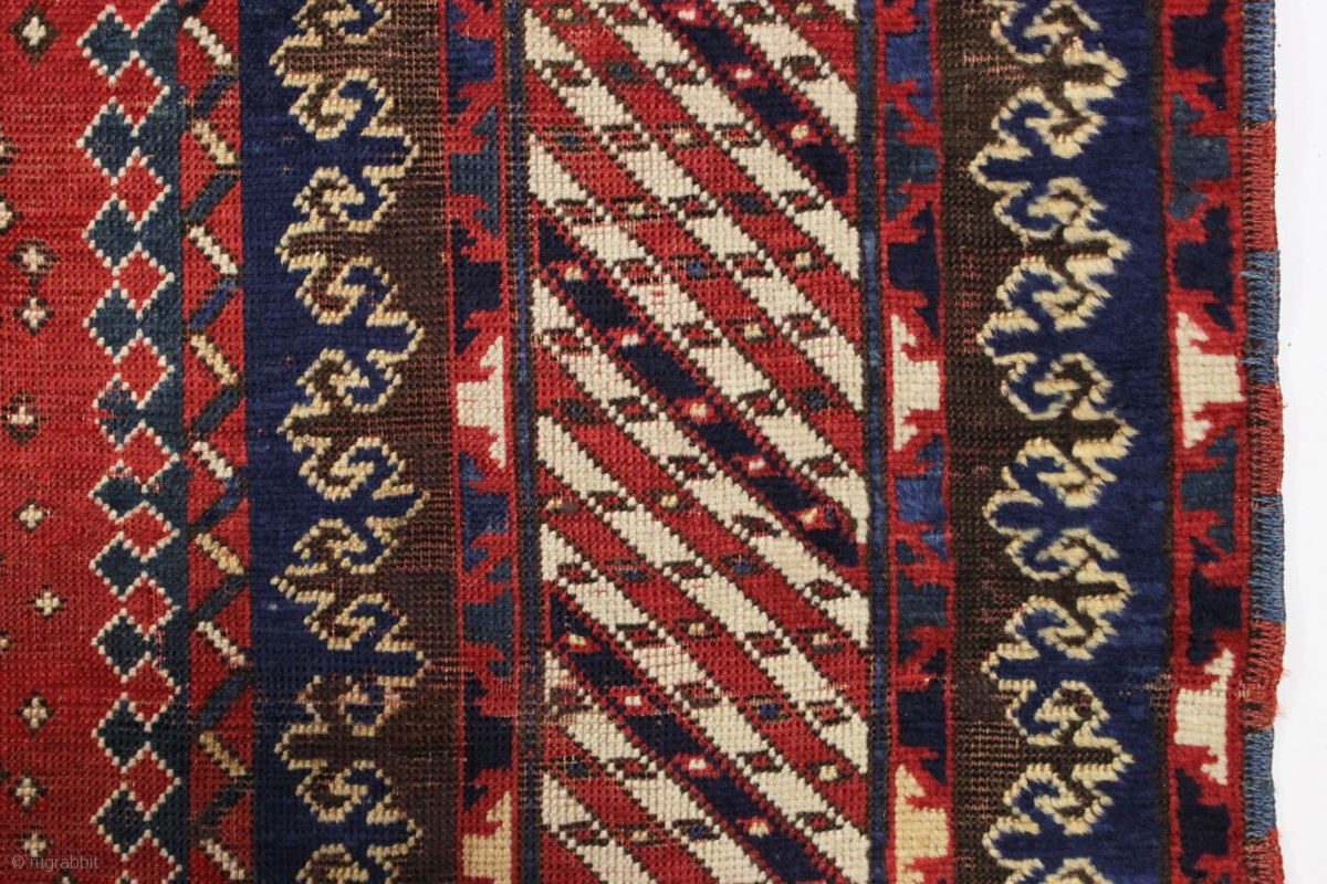 Antique large kazak with tiny stars, or are they snowfakes? The spacious field framed with an unusual eye catching striped border and a matching pair of terrific trefoill minors. All beautiful natural colors. Mostly fair pile with slight center wear and brown oxidation. Splendid old weaving, ca. 1875. 5'4" x 7'5"