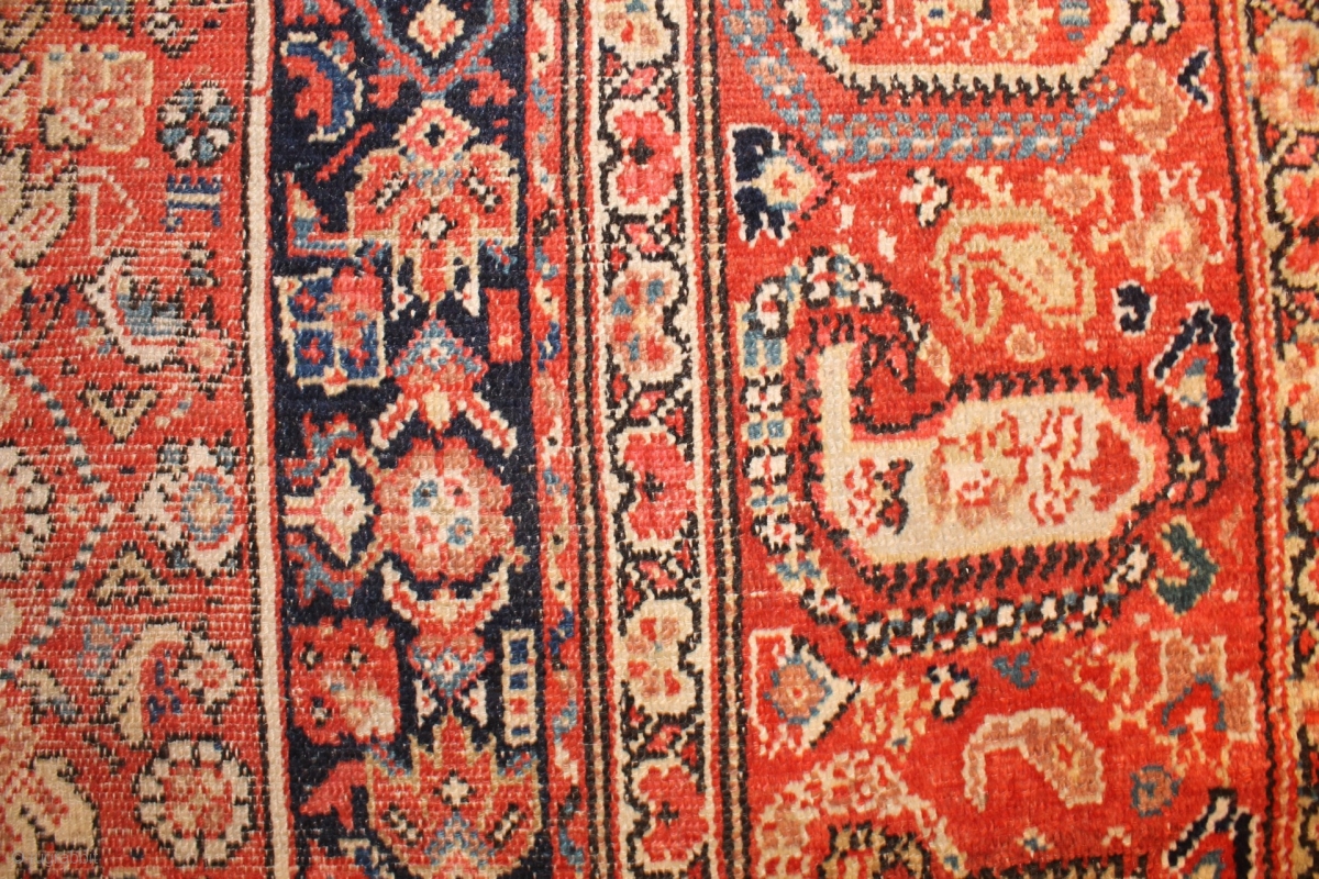 Antique Persian rug, 450x196-205, published in jp Willborgs book Hamadan, as plate 22, attributed to Bibikabad and dated 1840-1880. Low in the middle and more pile in the borders, all good colours, nice patina. i will take better pictures outdoor when the weather gets better. Rug has some flat stiching, most in black, old yarn has corroded, but also some red, i can only see it from the back.