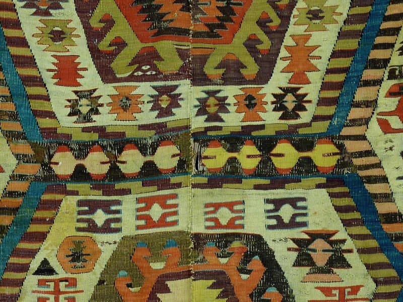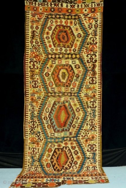 Aydin kilim, around 1850, 400x160 cm, outstanding colors with full anatolian early color spectrum including deeply saturated early aubergine.... perfect wool and weaving quality. Old, large scaled main field and end design motifs.Oxidizations to the browns and blacks, some old repair here and there, otherwise good condition compared to its age. please look at the other pieces as well: http://rugrabbit.com/profile/5160