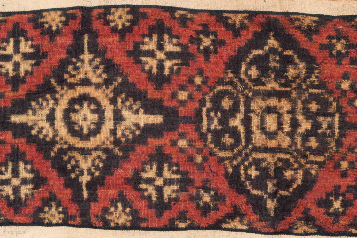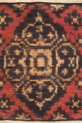 The double ikat design is built up from tiny rectangles, a structure enlarged in the end fields where 8-pointed stars and crosses are placed within a checkerboard of alternate light and dark squares. The repetition of motifs along horizontal and diagonal axes gives the cloth great pictorial charm. The pattern is framed along the selvedge by an undyed width, and by a row of small pretty florets at each end; the fringes are untwisted.
