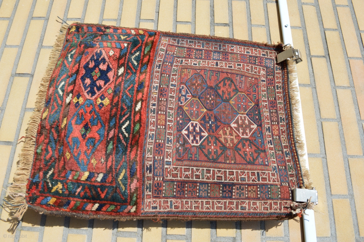 Colors for sale, Antique Luri Bahtiyar Bagfront with soumak weave.