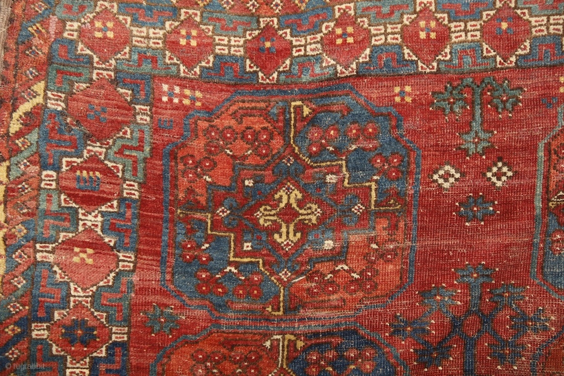 Early Ersari main carpet, around 1850, wool on wool, 270x215 cm. Nice asymmethrical archaic drawing with wonderful colors, greens, blues, reds, yellows... great scaling with the spaces between the güls, needless to say anything else, beautiful work of tribal art. Absolutely not a commercial piece! Happy, as most of the Ersari people could have been :) Please take a look around my other pieces: http://rugrabbit.com/profile/5160