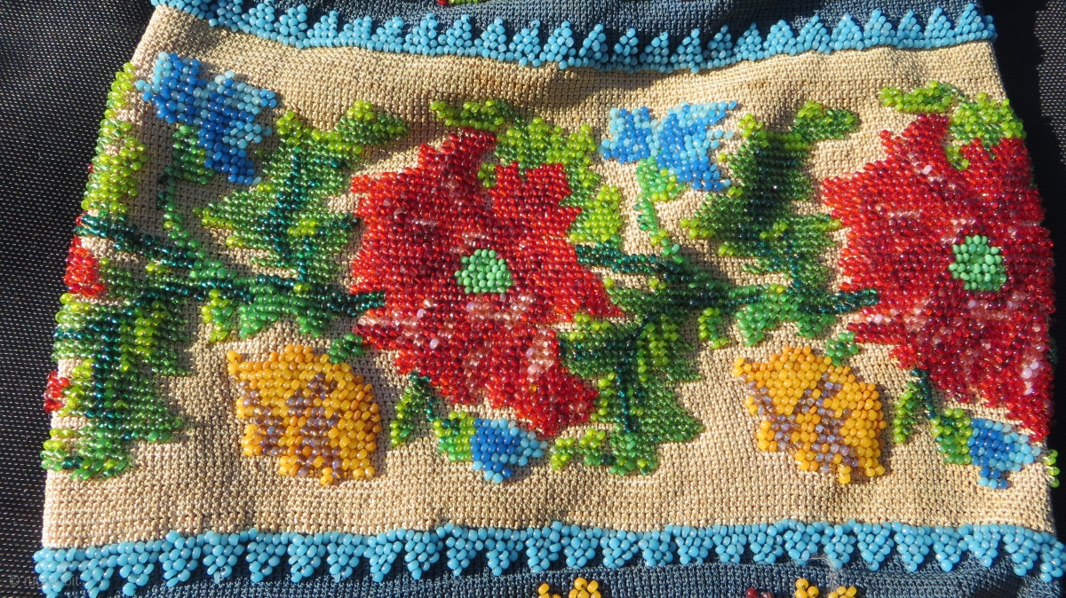 Exquisite micro beading to this purse made over 100 years ago, probably in France.Tiny beads, arranged to depict a wonderful assortment of flowers: roses, pansies, marigolds and Morning Glory in a broad central panel on a ground of iridescent pearly beads, surrounded by two panels of with scrolling vine leaves on either side.size18x16cm