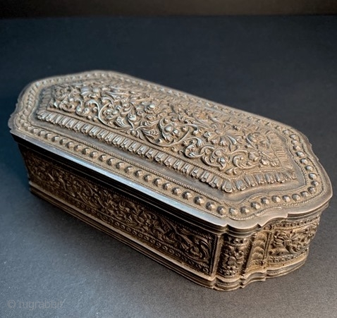 Fine and elegant 19th century Sri Lanka repoussé and chased silver box. Excellent condition, except a few tiny dents on the bottom edges. l: 14.2cm/5.6in x w: 4.2cm/1.6in x h: 6.2cm/2.4in.