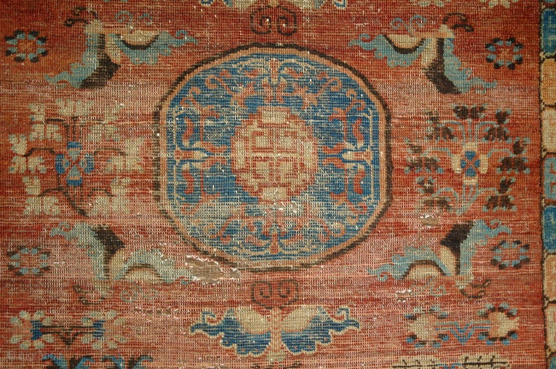 Fragmented East Turkestan Khotan Carpet, great color and classic one medallion drawing. Top border missing. 155 x 236 cm