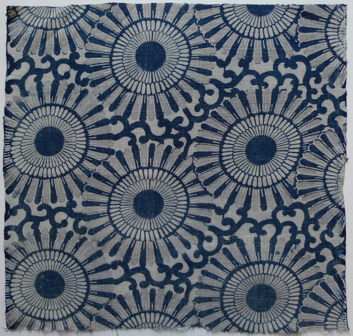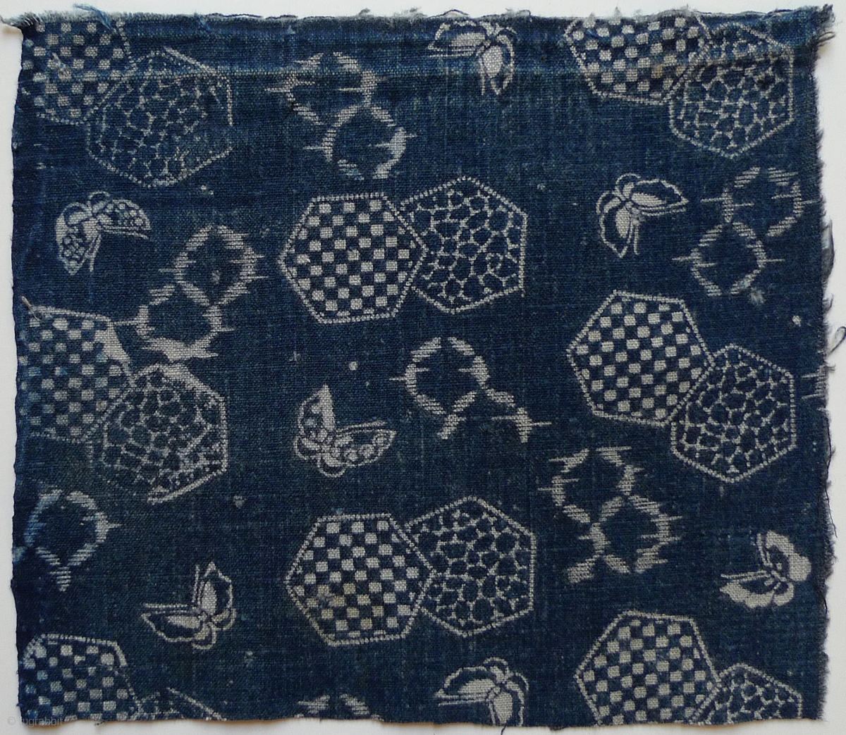Group of 5 Old Japanese Indigo-Dyed Hand-woven Cotton Katazome. Assorted sizes: #1 10.75" x 13.25" selvedge to selvedge (sold); #2 13.25" x 13.75" selvedge to selvedge (sold); #3 11.75" x 14.5" selvedge to selvedge (sold); #4 8.5" x 9.5" one selvedge; #5 16" x 13.25" selvedge to selvedge. Four of these katazome are particularly nice variations of the traditional chrysanthemum ("kiku") pattern. #3 shows small butterflies flitting around faux-kasuri and unusual checkerboard hexagons. To see more textiles and books from my collection please go to www.susanmeller.com