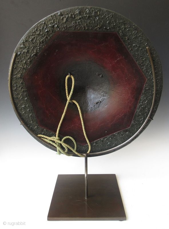 Japanese circular jingasa with a gradual domed top, rough textured to simulate leather. The composition is of bamboo, paper, layers of Urushi lacquer work with green lacquer, the edges decorated with two gilt mon of the Mori Clan. The interior is finished in green textured lacquer with red lacquer accent. Mounted on steel plates for presentation.