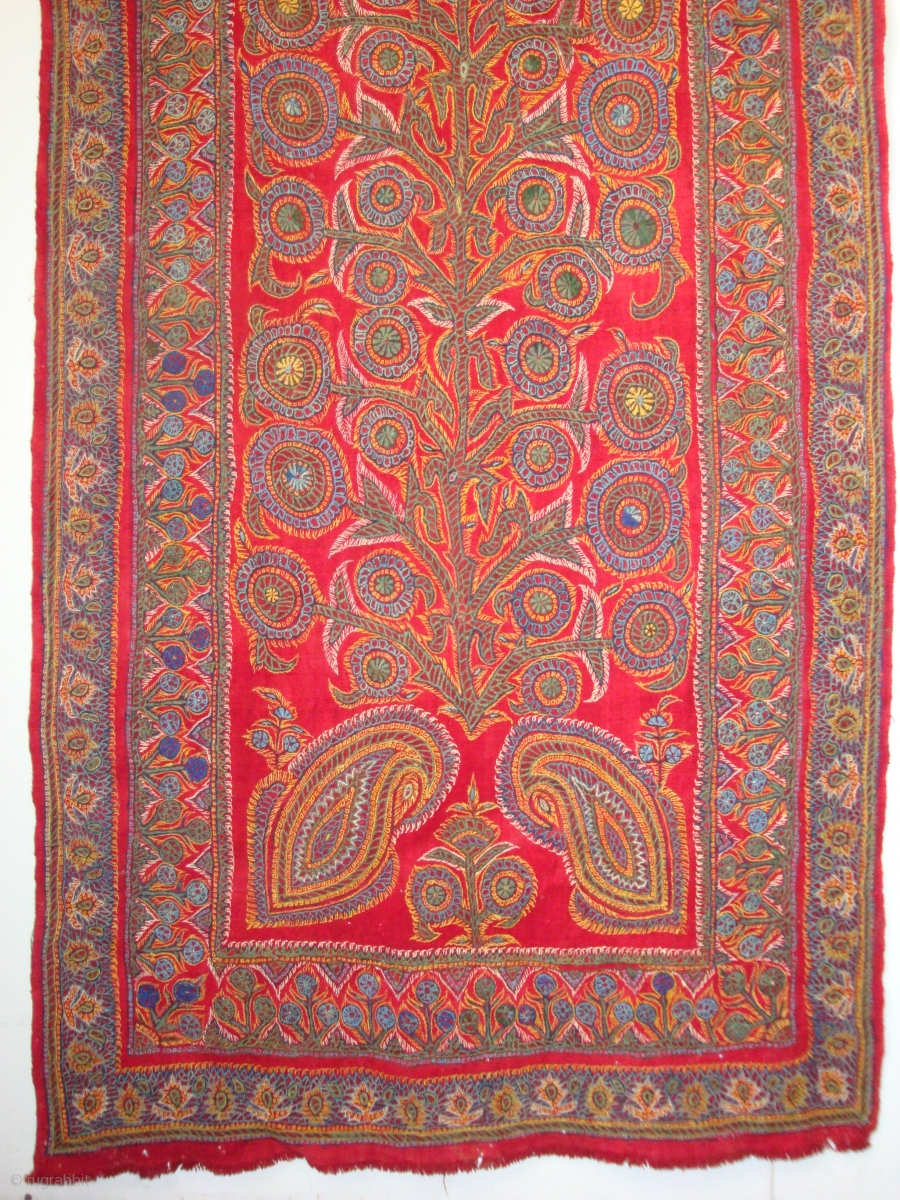 Kirman Tree under Arch embroidery, wool on fine red pashmina plain weave. 30 x 108 inches. Circa 1900.