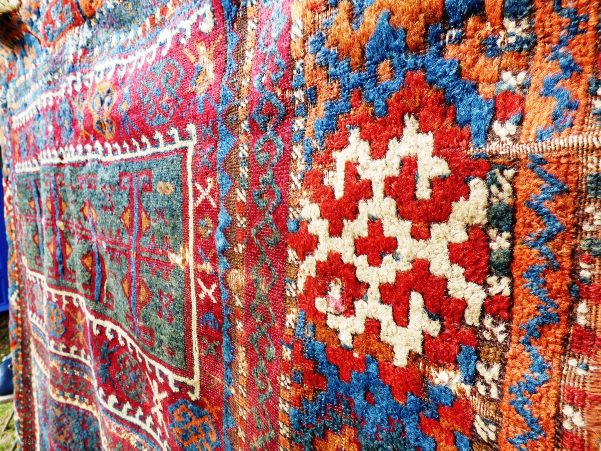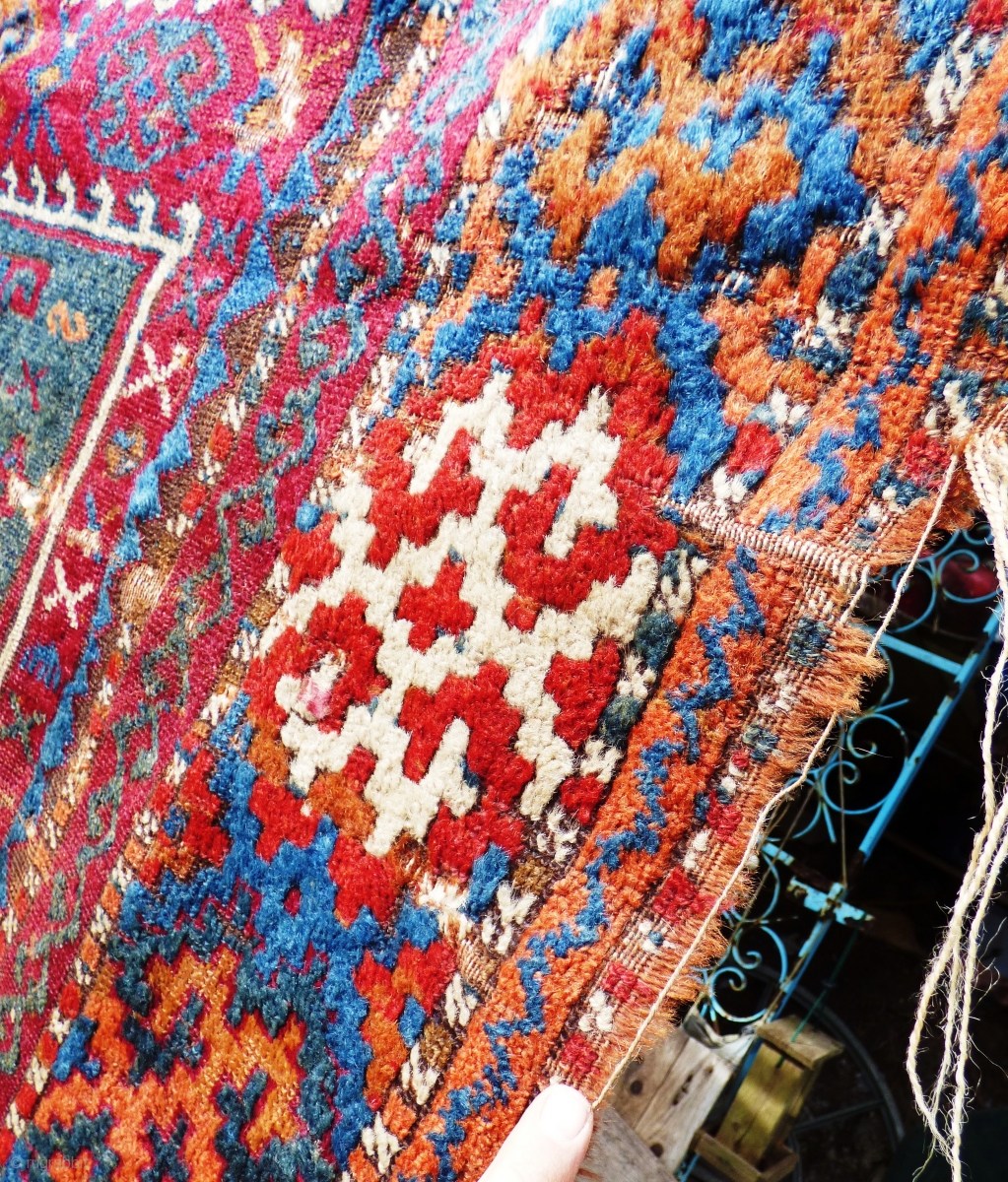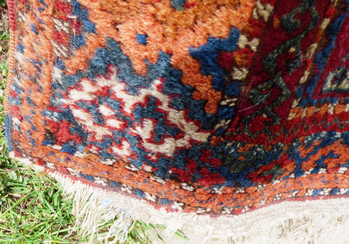 Kurdish Anatolian ‘Yuruk’ rug. Southern Turkey Gaziantep. Braided ends. Of irregular dimensions. Possibly a door rug. Glossy wool, great colours. Wear, worn kinks, see photos. Size: 6 ft x 4 ft 6 in 1.84 m x 1.32