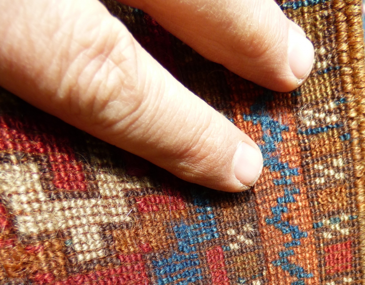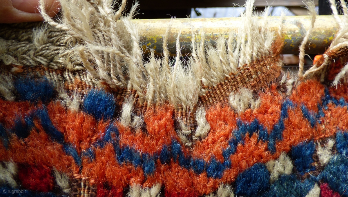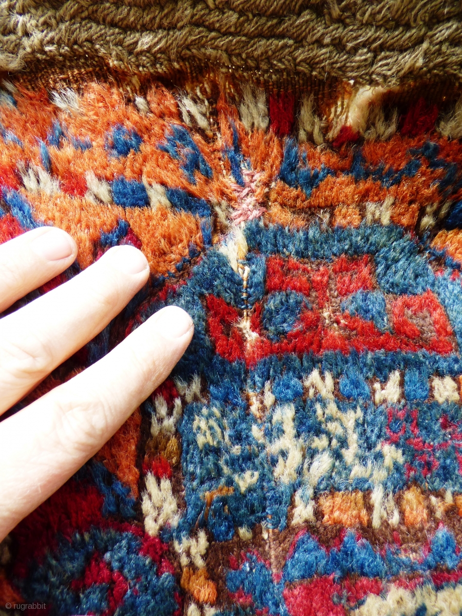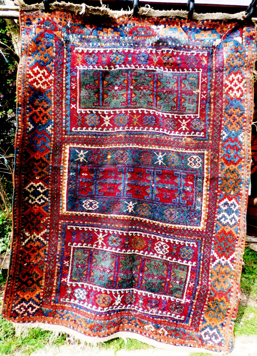 Kurdish Anatolian ‘Yuruk’ rug. Southern Turkey Gaziantep. Braided ends. Of irregular dimensions. Possibly a door rug. Glossy wool, great colours. Wear, worn kinks, see photos. Size: 6 ft x 4 ft 6 in 1.84 m x 1.32