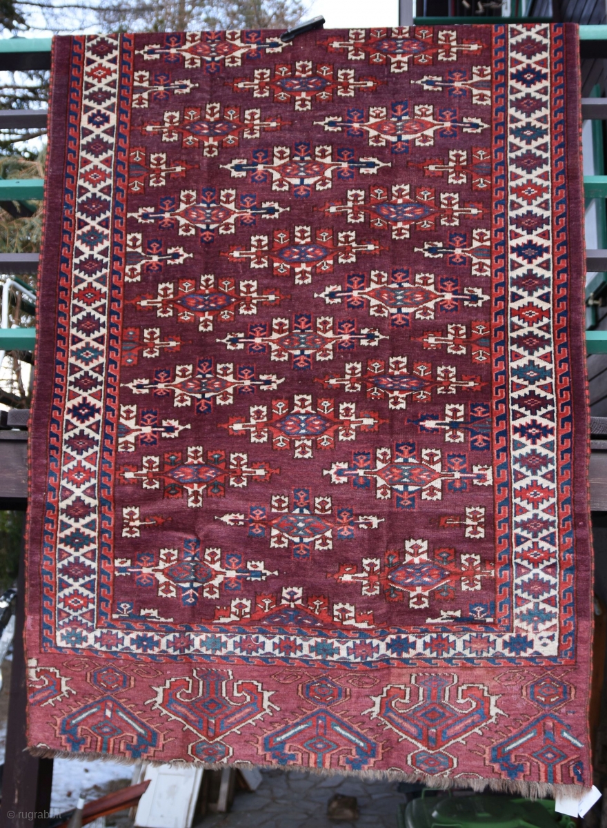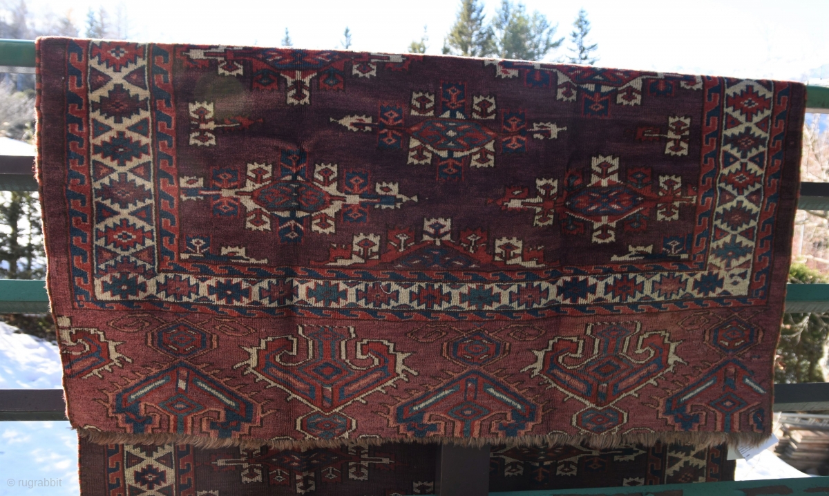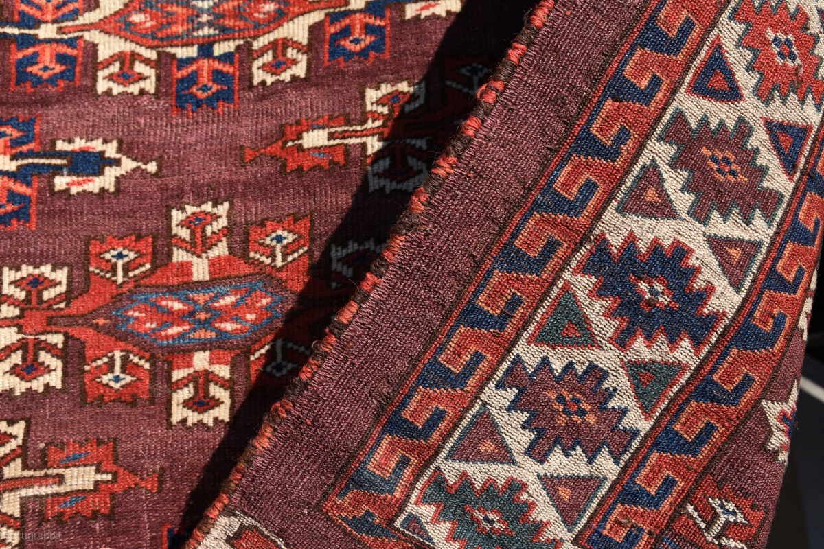 Late 19th decorative Yomut / Yomud Kepse Gul main. Overall good condition, some minor repair, likely some loss towards lower end. Pics made in different lighting cinditions, interesting how color changes with/without direct sun. You may also directly inquire to: finkmarcel.99@gmail.com