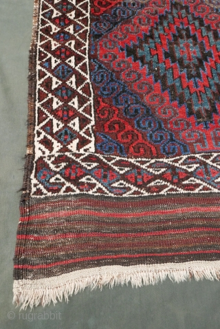 Mushwani Belouch/Baluch, circa 1900, 2'10"x5'6", wild and beautiful, with vivid red, blue, aubergine and white; symmetrically knotted; kilim ends are complete except for small rough spot at the upper left corner; great floppy handle; upper and bottom thirds and borders have moderate silky pile - middle has low pile with corrosion of some of the aubergine and brown. Degradation of the selvage here and there. On my wall these past twenty years. a prize from Tony Kitz Gallery. Newly cleaned. sold thank you.