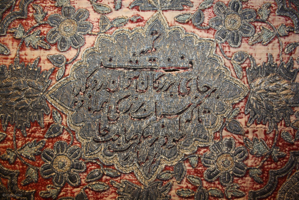 Persian 17th/18th Century applique and embroidery with silk and metal threads on velvet foundation, mounted, 91x151cm