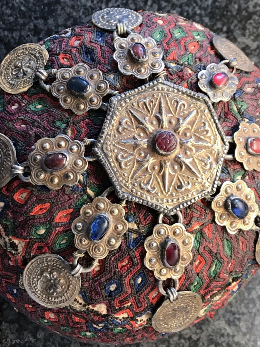 a rare complete antique silk embroidered Yomud / Yomut tribe Turkoman / Turkmen young man / boy's hat with original gold appliqué on silver talismanic crown. There is a distinctive beauty to a good Turkoman embroidery that is unlike that of their neighboring group, the Uzbek people as this exceptional example shows. These were made by Persian Turkmen people. It is embroidered using fine silks that are chain-stitched. The rich design is rendered with array of beautiful colours typical of the Yomud style. Such hats were worn by young men and the talismanic jewellery on it contained sacred texts and were there for protection. Often such jewellery were removed. It is nice to see one in original state. . It is a fine piece and a better example than most one sees. a lovely ethnographic garment offered at a reasonable price. Email your questions. size: 15cm (6") diameter of the hat. 9cm (3.5") height.