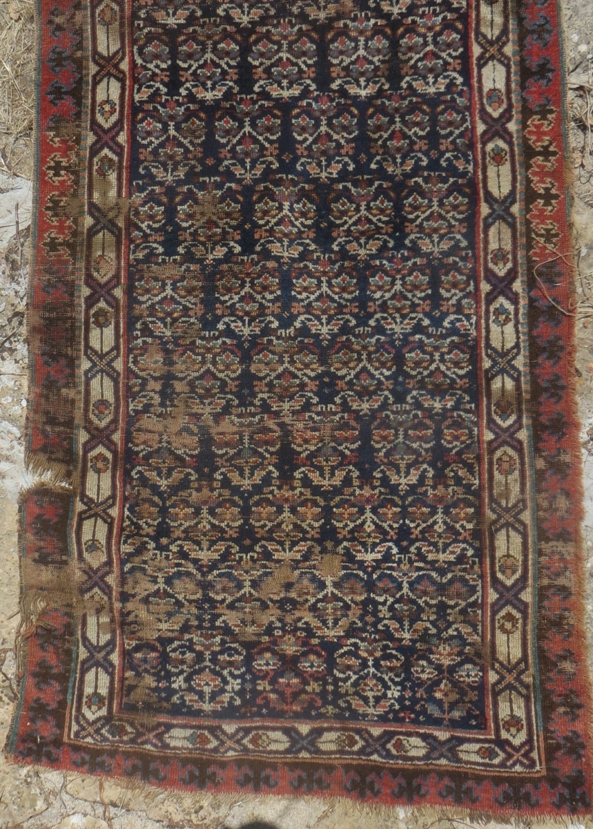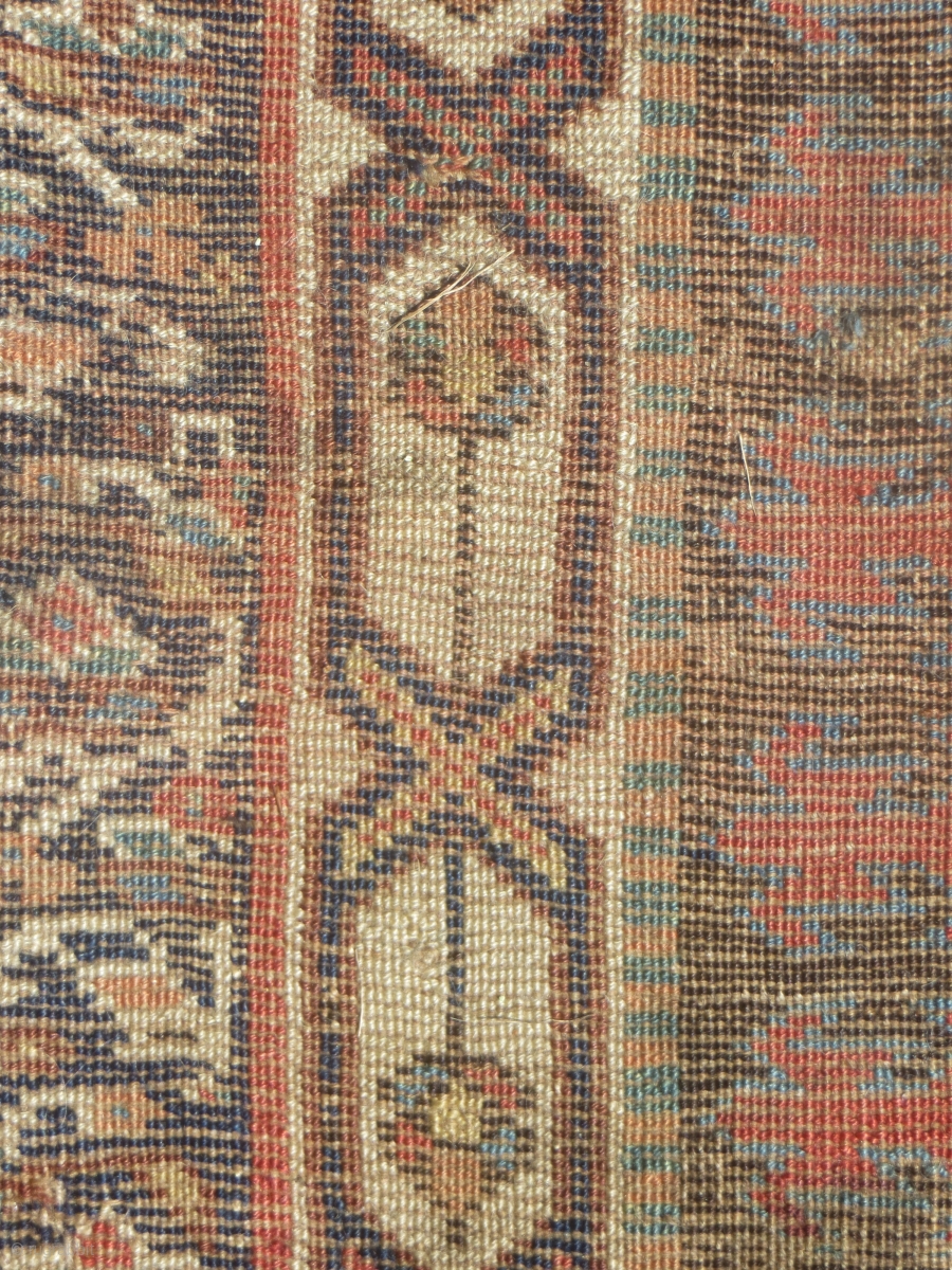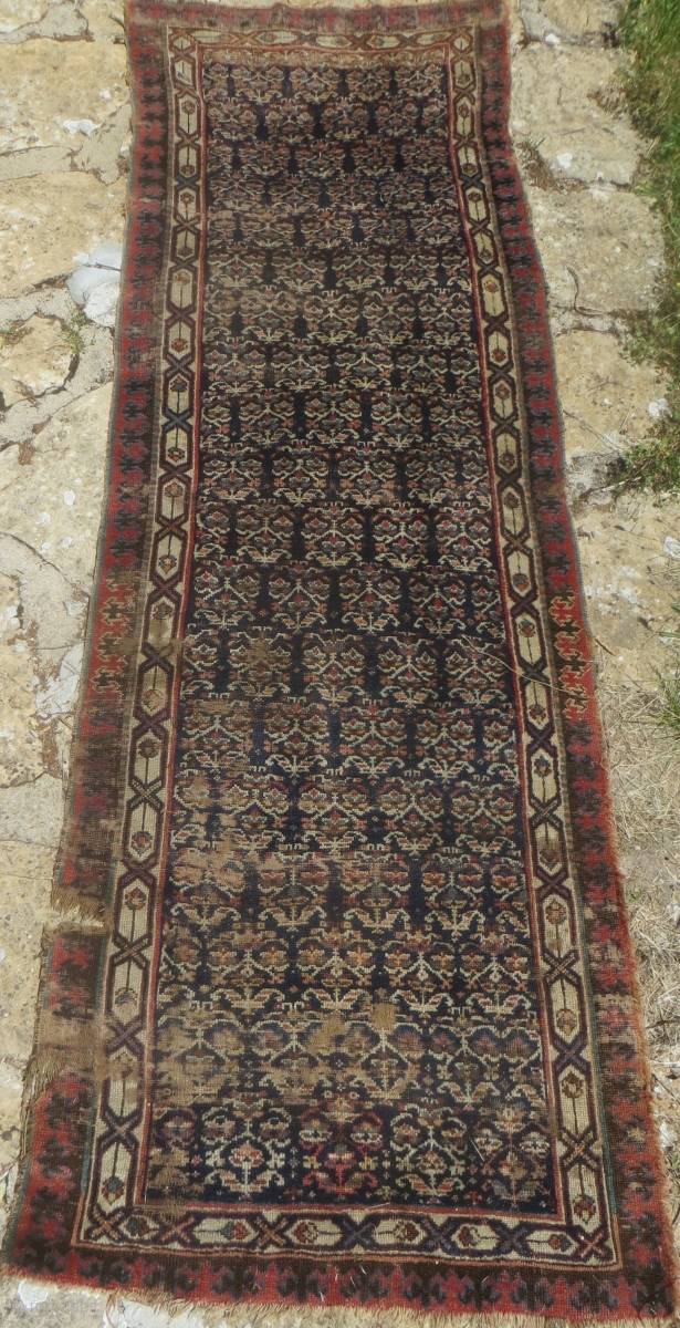 Shawsavan, approx 3 ft x 9 ft 3 in. 19th Century. Unusual border design. All good colors. Visible wear (see close-ups) but good pile makes it restorable.