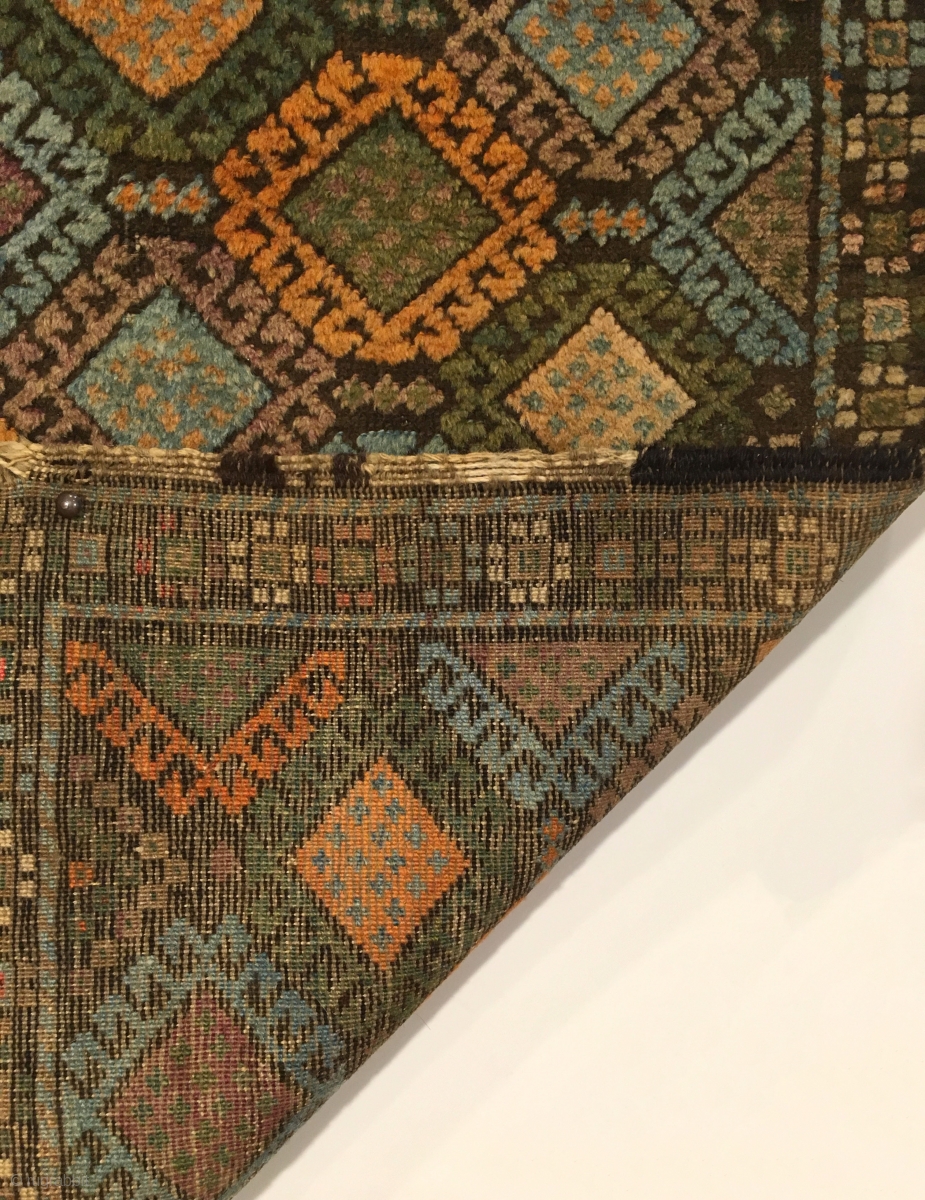 Antique Small Baluch Rug. Kurd. Last Quarter 19th Century. Jaf Kurd like saturated soft silky wool. The right balance of brown corrosion outlines colorful bird head diamonds. Original kilim ends. Excellent condition except for minor losses to goat hair wrapped selvage. 8 colors. 2’4 x 3’9. Delicately hand washed.