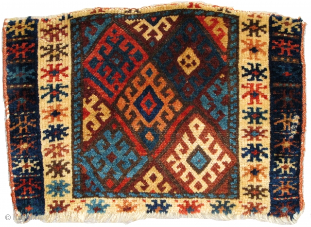 small fluffy Jaf Kurd Bagface. Great wool and subtle but sophisticated design features including border break and experimentation with color and abrash. a great little pet. 22"x16"