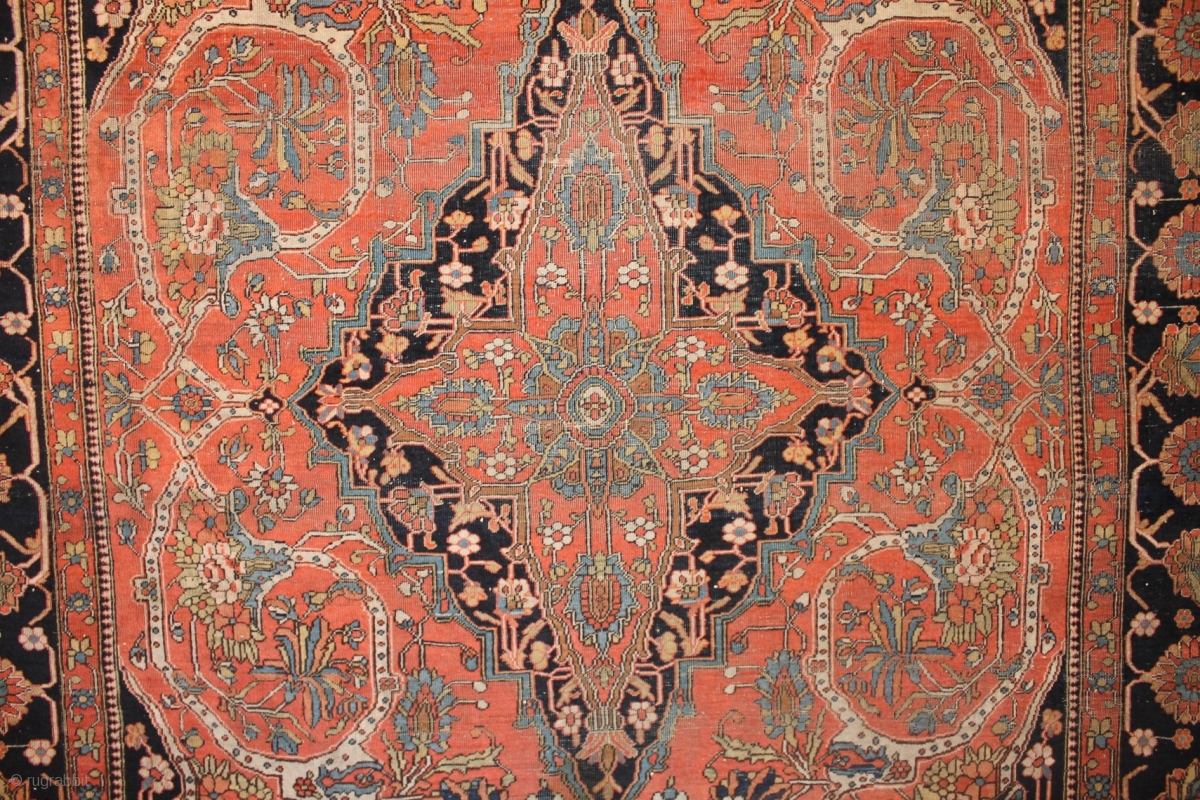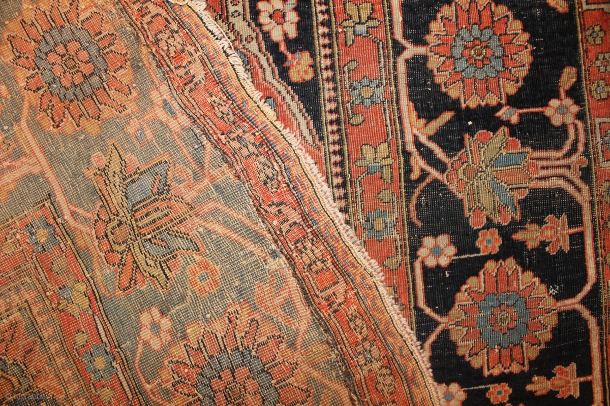 This is a so called Mohtasham Kashan rug, all good colours, and lots of them, and superb wool. This is either a copy of a Mohtasham rug or a early original one, it has a very primitive border. Rug has both blue and white cotton wefts and it might have handspun cotton warps, last four centimeters may have been rewoven, but the colour matching is perfect, so it may just be repaired. Rug is very thin and areas with longer pile feels like velvet. It has assymetric knots open to the left. This rug looks a lot lot like a rug published by Peter Willborg in his book; 1980-1990 Ten Years Jubilee Exhibition, plate 11. My rug feels more primitive, but not necessarily older. There is also a silk rug ascribed to the son of Mohtasham, that has this field pattern.