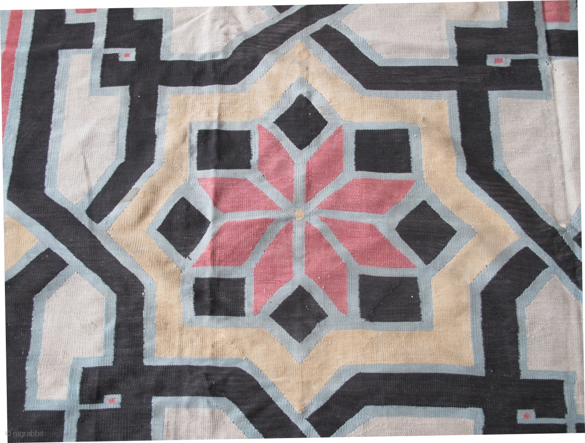 Spectacular Cotten Indian Dhurrie, 2.54m x 2.47m circa 1890. Design drawn from Hispano-Moresque art. Great colours and square format. Some staining and old repairs. Priced well.