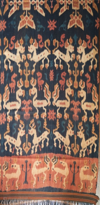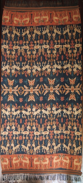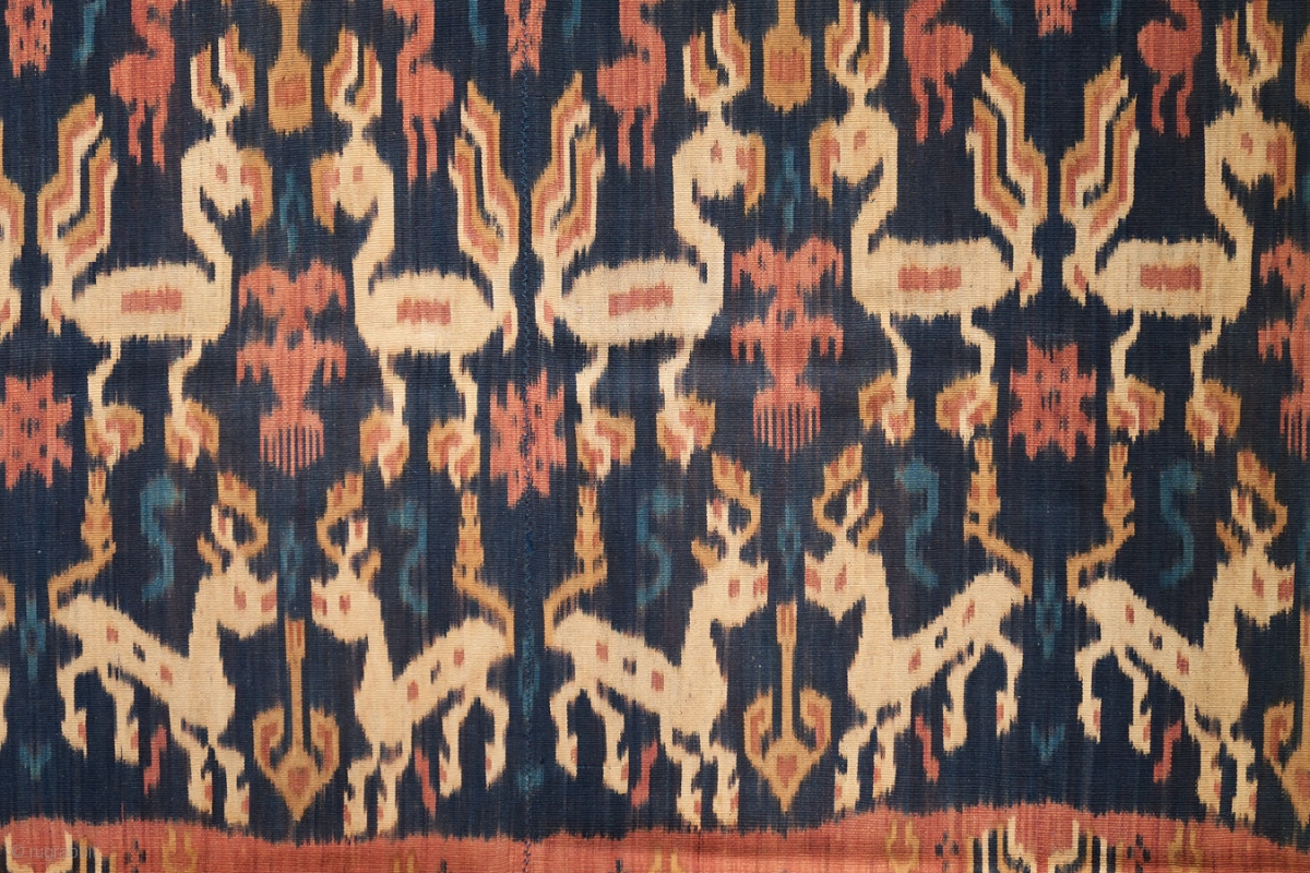 A gorgeous men’s mantle (hinggi) from Rende in east Sumba, woven with a rich variety of creatures in red, blue and yellow-brown warp ikat. The textile is made from 2 long mirroring panels joined together along the selvedge. Its motifs are arranged in 4 bands, also mirrored on either side of the central section of large flowers. The main motifs are similarly designed, creating repetition and variation: the 1st band has horses, the 2nd chickens, the 3rd deer, and the 4th another style of chickens. Filling the picture are smaller creatures and motifs in solid blue or red, whose darker tones give them the appearance of being recessed. The artistry of the weaver is displayed by the perfect alignment of 2 halves of small geometric motifs joined at the seam.