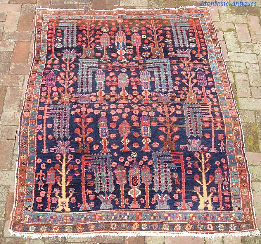 Tribal Village. 4 ft 5 inches x 6 ft. Cool turn of the century with classic old Bakshaish design. Pretty rare thing! Real good condition w/ full pile. Innocuous rip repair from baling hook or whatever. Invisible on top and if i didn't tell you about it you'd never find it. $25 us shipping.