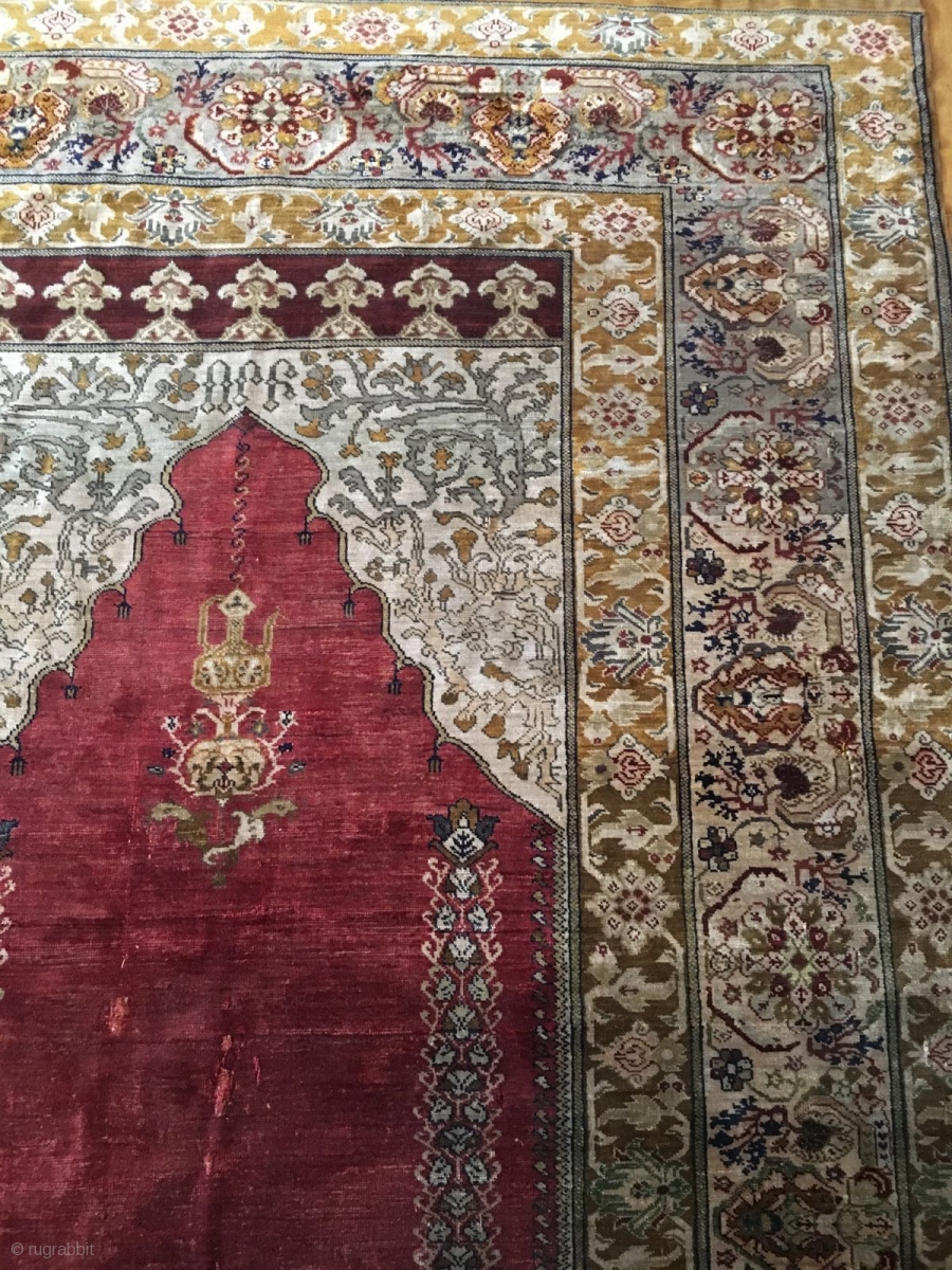 Turkish/Armenian full silk prayer rug, c. 1850-1900, signed in Armenian as "Orp (Orphan)" on top of the mihrab. Probably from Agin(Kemaliye) or Hajin(near Kayseri) Armenian Orphanage of Ottoman Empire. 190cm x 127cm. Fine condition.
