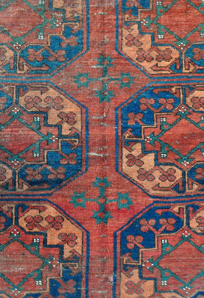 Turkmen Ersari Main Carpet with the Guli-Gul design, cool border and great colors - some wear damages and low pile areas but inexpensive and still usable on the floor - circa 1875 - 7'2 x 8'10 - 219 x 269 cm.