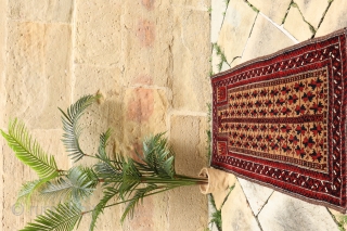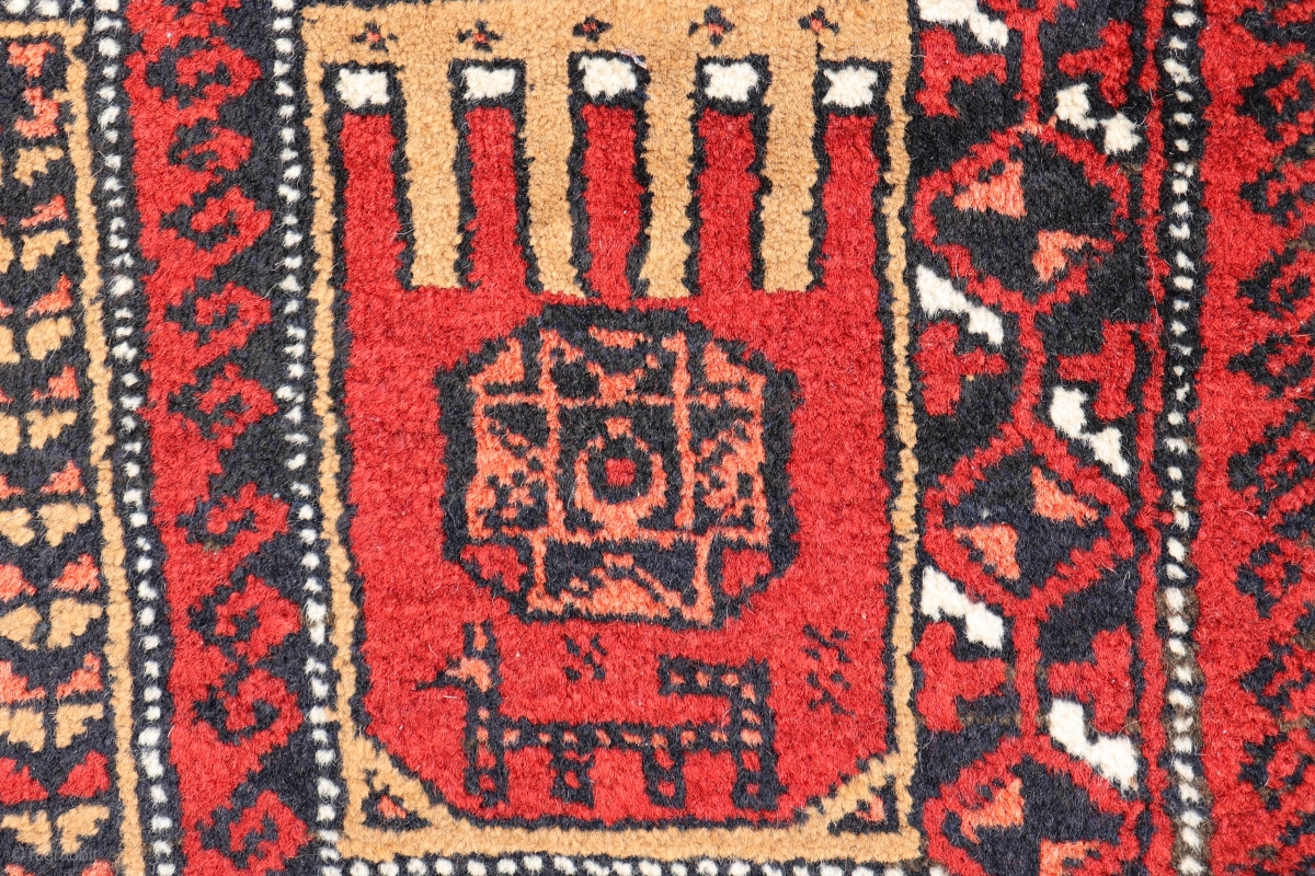 An unusual Persian Baluch prayer rug. Within the hand, a gül with an eight pointed star and a goat have been woven. Soft and shinny wool, with full pile, in mint condition, including the original goat hair sidecords. All natural dyes. a1601496. 142x82 cms. You can buy this rug directly from our web: https://nomada.biz/en/producto/belouch-rug-from-iran-142x82-cms/