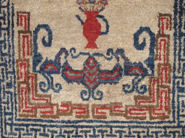 Unusual small Chinese rug with auspicious bats and flower pots. Uncommon use of madder red and un-dyed brown wool pile. cotton foundation. Perhaps Ningxia but seems a bit aberrant. Perhaps Gansu or Inner Mongolia? a very pleasing happy little rug. 2'x3'4" / 61x102cm