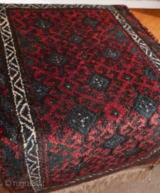 This is a very plush Baluch 'ballsht' with a high and lustrous pile, blanket-like; colors - two of aubergine, blue-green, reddish-orange and white - are deep, rich and organic; circa 1910; 20"x35"; excellent condition but for a couple of moth nibbles at the very top edge.