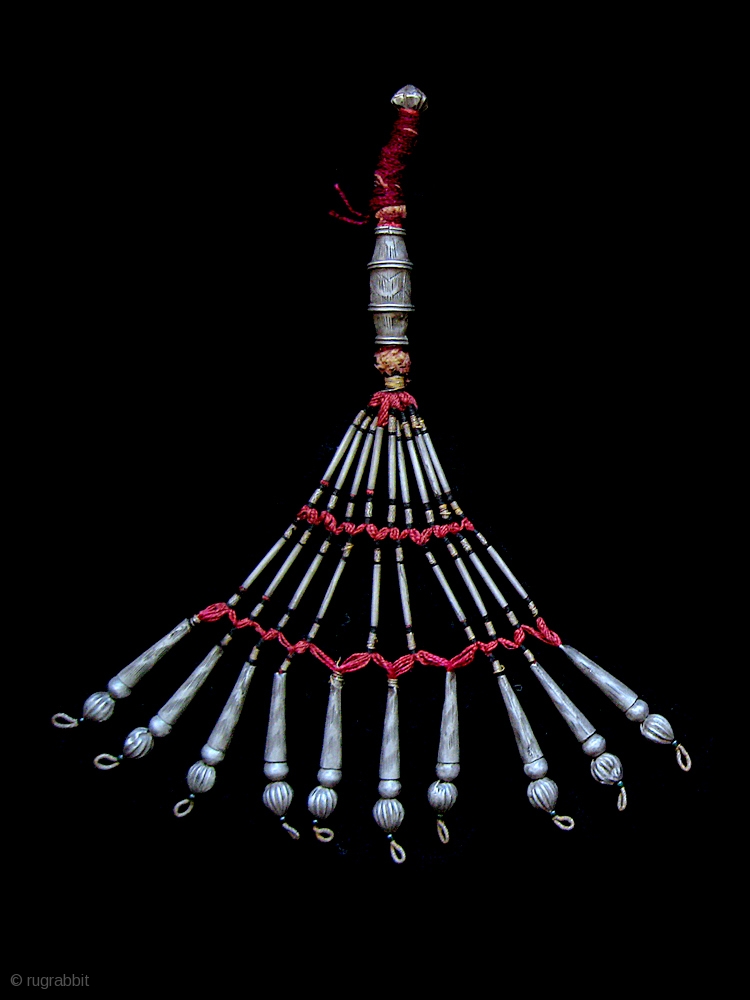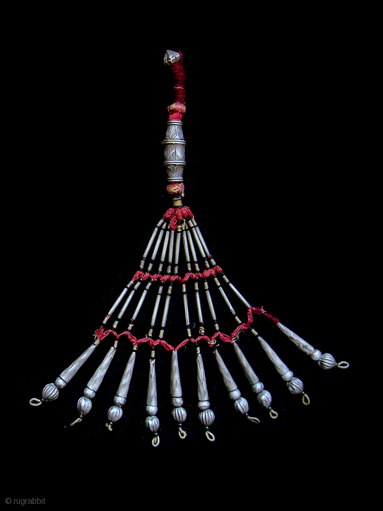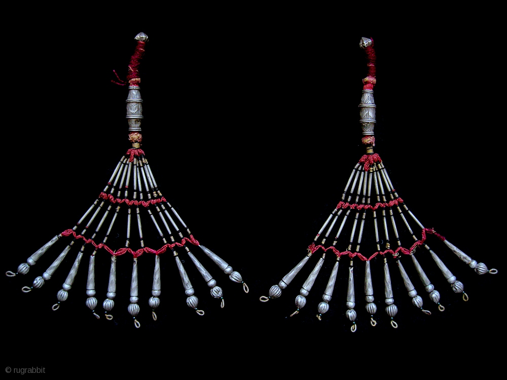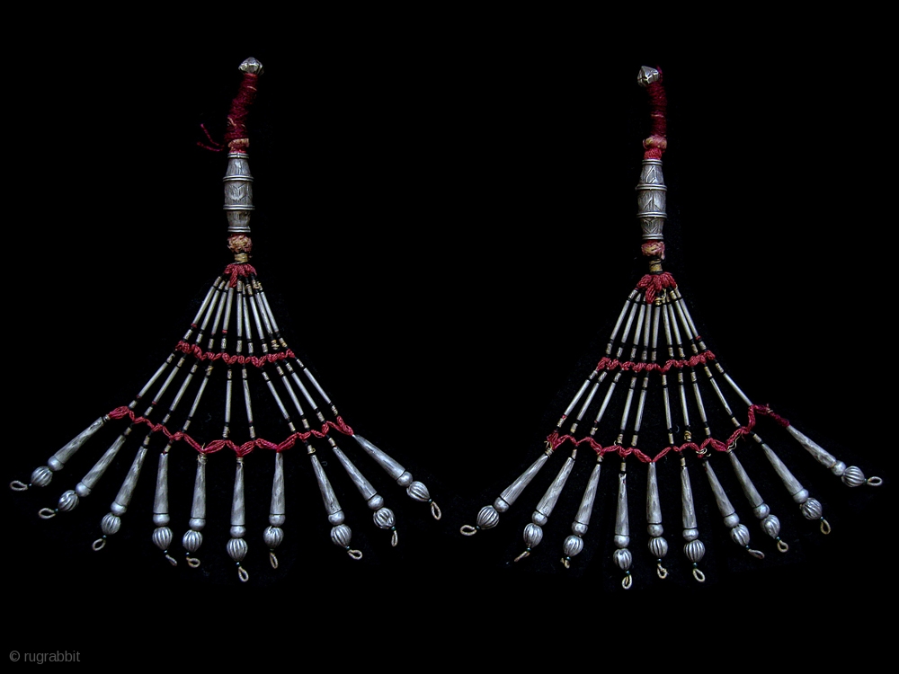 a very Rare pair of antique Central Asian Silver Satchkhalta / bridal hair dorsal (worn over braided pigtail ). This one of a kind pair dates between mid to third quarter of 19th Century. Having read almost all of the books on Central Asian and Turkoman jewellery, to my knowledge, nothing like this example has ever been published. Some leading expert friends have suggested that this piece is possibly an urban one made for the bride of a noble family. The fine quality of the work, the intricate patterns on the silver beads and the delicate manner these beads have been strung with red silks is way too sophisticated for rural jewellery. It is likely the work of Uzbek people of Khiva but can also be that of Tajiks in Bokhara / Bukhara. As this example is by far more sophisticated than typical jewellery of both of these cities, it is also plausible to suggest it could be the work of an unknown group. One thing is for sure, it is one of a kind. Offered fair price. In excellent condition. Email me your questions. size: 20cm x 15cm (8" x 6") each.