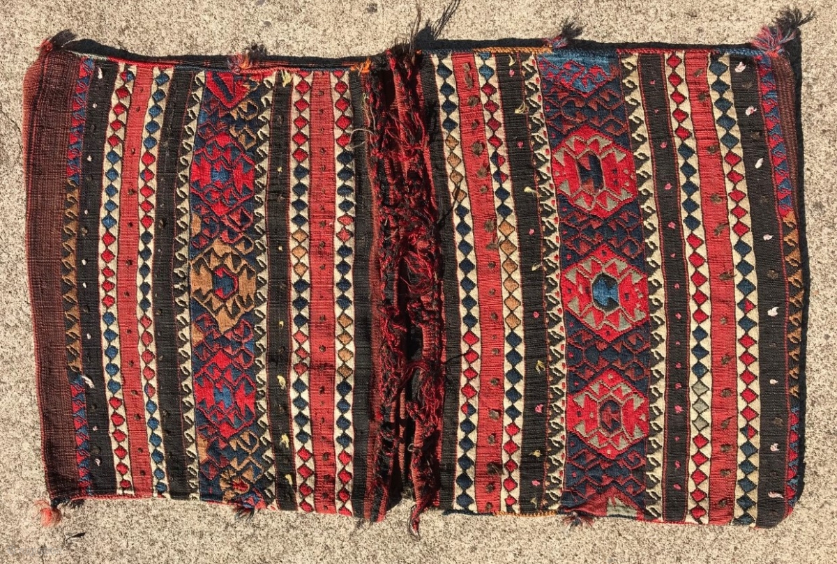 Weftless sumak saddlebags with silk highlights in excellent condition, 1'10" x 3'3". Eastern Anatolia, late 19th or early 20th c. Dynamic drawing on the face, and a terrific banded back.