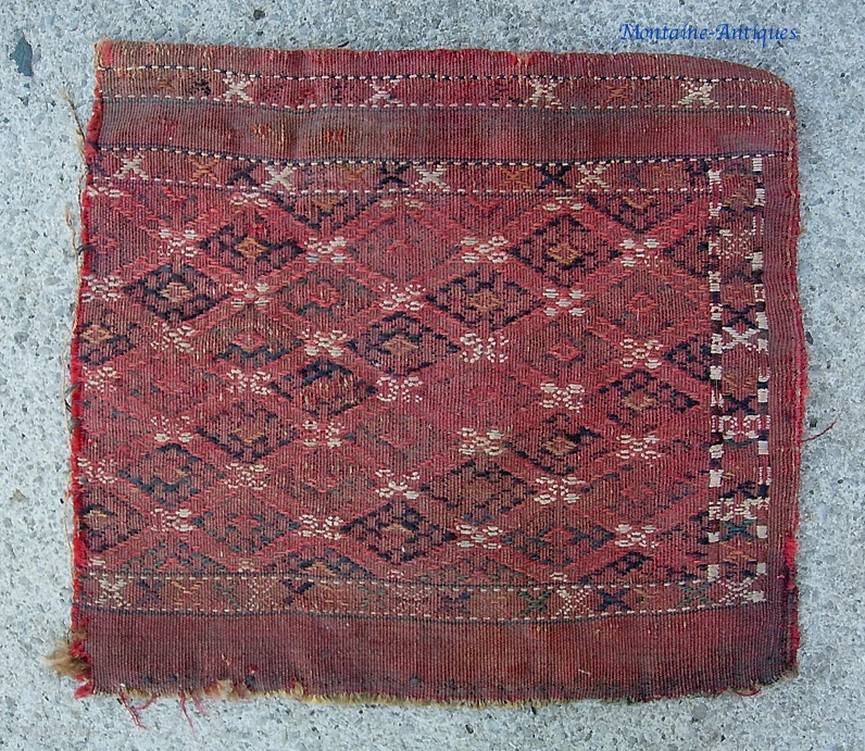 Turkoman tapestry. 12 x 14 inches. Flat woven bag face. Well worn and missing part of one side. $10 shipping to usa.