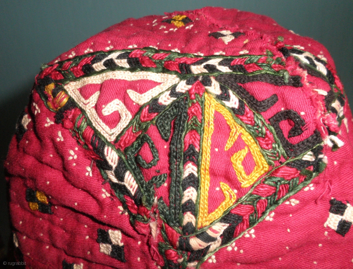 a dark green and an almost olive green (created by the blue fading over time, leaving a very yellow green, which is often found in Chodor embroidery). The bonnet measures 5 1/2" from front to back, 6 1/2" top to bottom in the back and 6 1/2" wide. Classic Chodor embroidery motifs, a great Russian cotton print inner lining and there is even a faded blue cotton tie string sewn into the front corners.