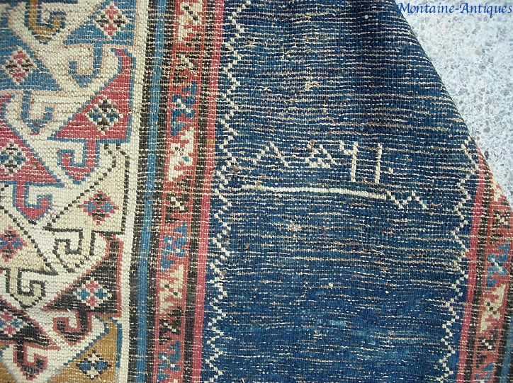 Dated 1843 Talish. 3 ft 4 in. x 10 ft 6 inches. ie., i assume it is a Talish but i am not 100% on this. First, the condition report: 1. The rug has been reduced and mitered. The location of this is shown in the photo with the arrows. 2. The pile along the sides has apparently not been reduced but the original selvedge was removed (probably) when the current overcasting was applied. Aside from this the rug is untouched and pristine in that no one has attempted any foundation or pile repairs. An ingenious person could probably come up with a good plan for restoration. Being clearly dated 1258 (Gregorian 1843) if this is truly a Talish it is to the best of my (limited) knowledge among the earliest dated examples of Talish weaving. Plate 211 in Azadi et al., shows a rug that predates this one by five years. Both rugs have borders not typical of that usually seen on later 19th century Talishes. Aside from the date, the open field has only one tiny character comprised of five knots. Spiritual minimalism. i think this qualifies as an important rug. Call me for a thorough in-hand condition report and price. $25 shipping in the usa.