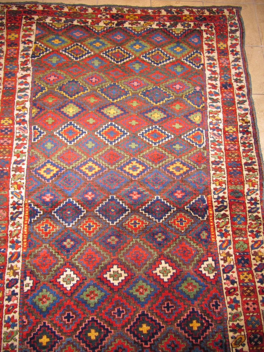 Antique Kurdish tribal rug with fantastic colors and shiny wool. Circa 1870. Size: ca. 260x140cm / 8'5'' x 4'6''ft The design of this village weaving displays interlocking stepped diamonds that completely cover the field. The design and repertoire of this rug are simple at first sight, but if you look at