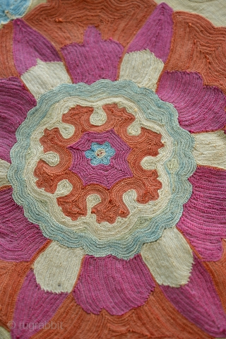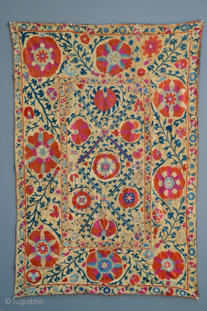 Antique Uzbek Suzani. Excellent colors and very fine silk embroidery threads. Subtle Mihrab prayer design. Embroidery is in very good to excellent condition, background linen has some weakness issues. 3 separate and equal panels, complete, natural indigo borders, early cotton fabric backing. 1850 or earlier. 70 x 46 inches.