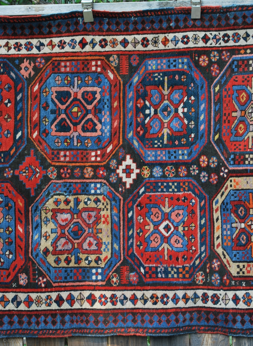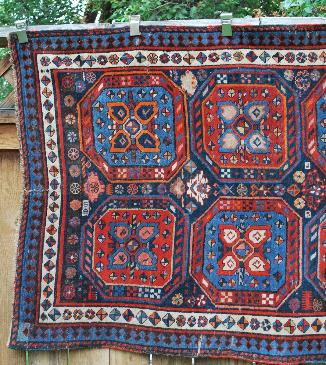 Late 19thc. Karabagh Runner, size - 3'8" x 9', condition - good ,full pile with no worn areas, few patches and three 2"-3" fold wearArmenian initials on top of rug, Possibly of weaver This small gallery rug is exciting & bold with all Borders & Ends Intact - nice overall look.