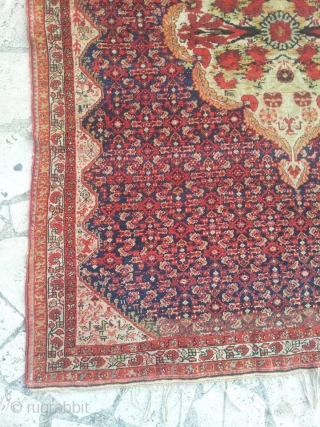 Very interesting piece of Maleyer. herati design with an amazing medallion gul farang style. The field is very full and rich also of little human motives and animals. size cm 200x145 ca. Age 1890 ca.