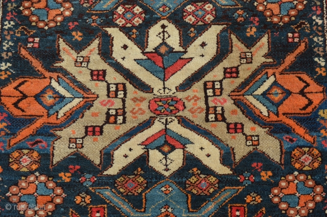 a very vibrant little Shirvan, early 20th century. Wonderful colors, some minor restoration. Metal hangers attached (sewn on) on the side, hangers also on one end. Needs a cleaning. Measures 5'7" x 3'9"