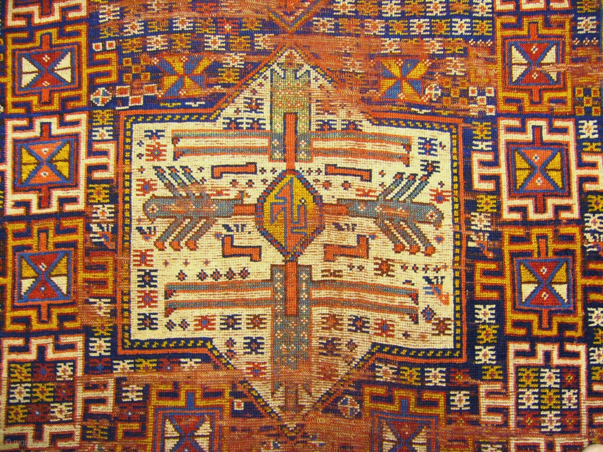 # 296 Great Kordi main carpet fragment, 145/330 cm, Darreh-Gaz region, Khorasan, the upper borders and the original selvages are missing, some areas of wear and a sewn crack; a unique field with archaic medallions, a main border with a lot of cited motifs and above all the best natural colours you can imagine! No comparable piece is published up to date! Further information on request!
