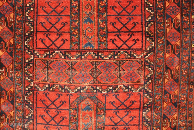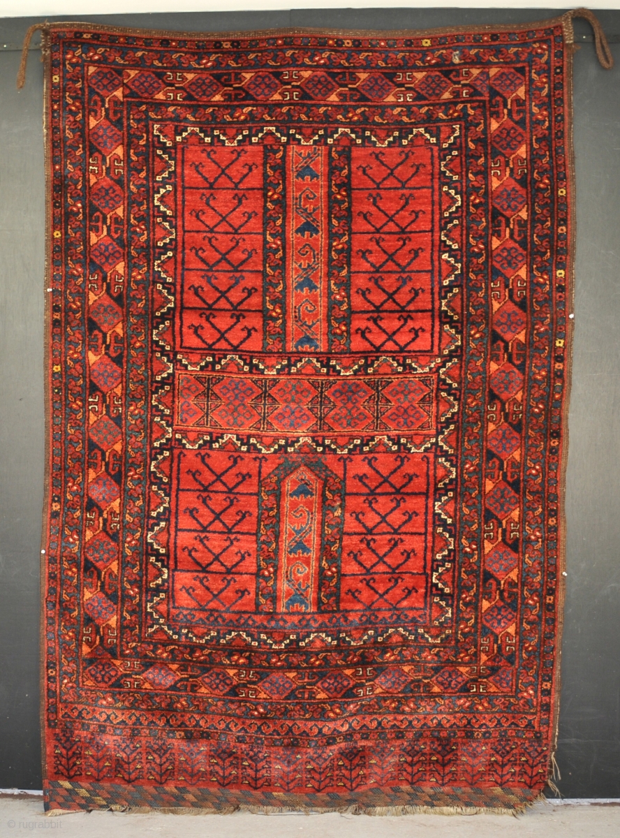 An antique Ersari Ensi with exceptionally thick pile and rich colours. slight loss to one corner two thumb nail sized repairs otherwise in amazing condition even retaining its hanging straps. 19th century. 226x153cm
