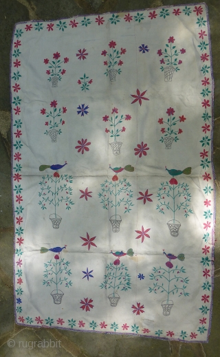 Special extra large antique Kantha quilt in great condition. 75 x 51 inches. Full of joyful whimsy with various peacocks sitting in the tops of potted flowers and/or trees. White thread running quilting stitch throughout. Will look dramatic draped across the back of a sofa or spotlit on the wall. Photos were take in somewhat dappled sunlight. Has not been ironed or washed. Bengal is known for its fine Kantha work made from cotton cloth that is quilted and embroidered with cotton thread and lots of running stitches. Several new kanthas just added to www.banjaratextiles.com